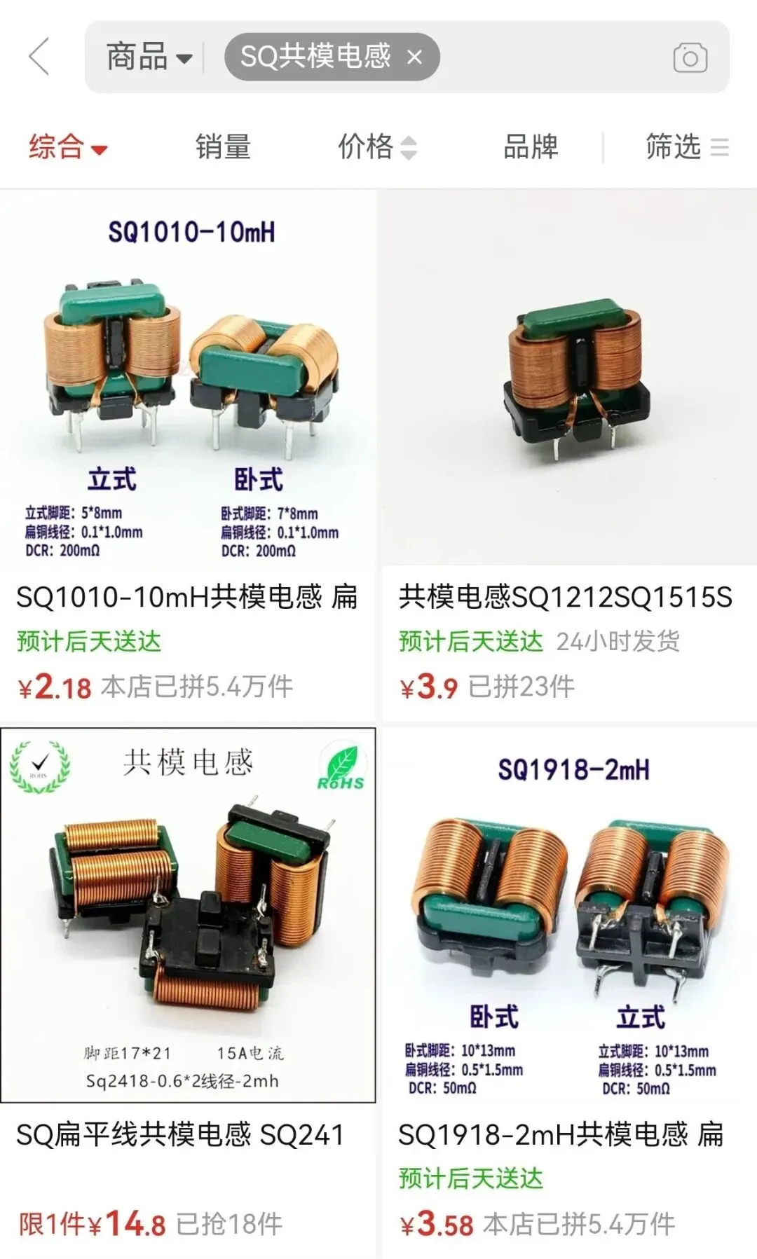 这类共模电感器在行业内一般称为SQ型共模电感,在某多多上搜索“SQ共模电感”,这个价格大家感受一下!我怎么觉得磁环、底座、漆包铜线和粘接胶的成本加起来都不止3块钱吧?中国这个工业克苏鲁的实力,恐怖如斯