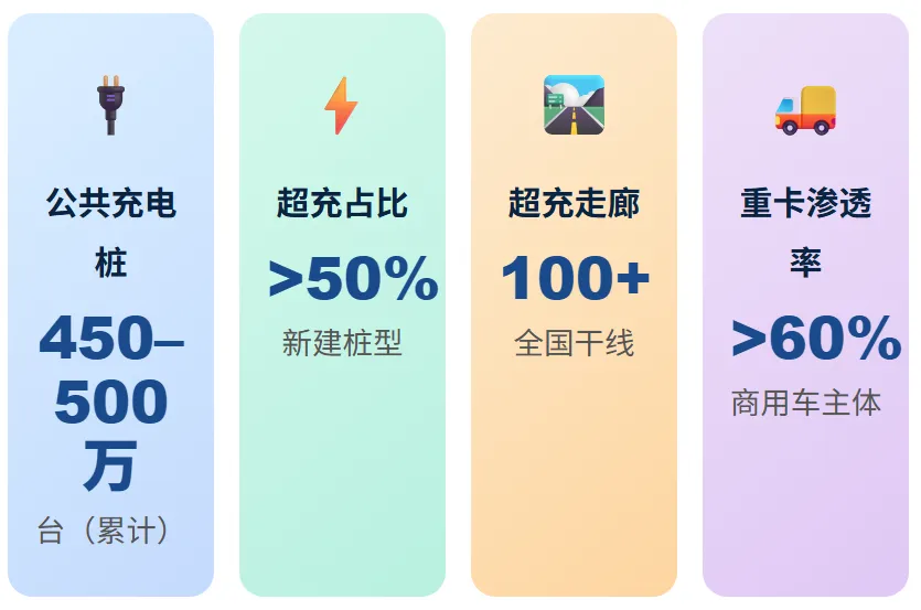全国超充走廊成网,重卡超充站从百座跨越至千座级;新能源重卡渗透率预计突破40%;充电桩总保有量有望超1000万台(含私桩)