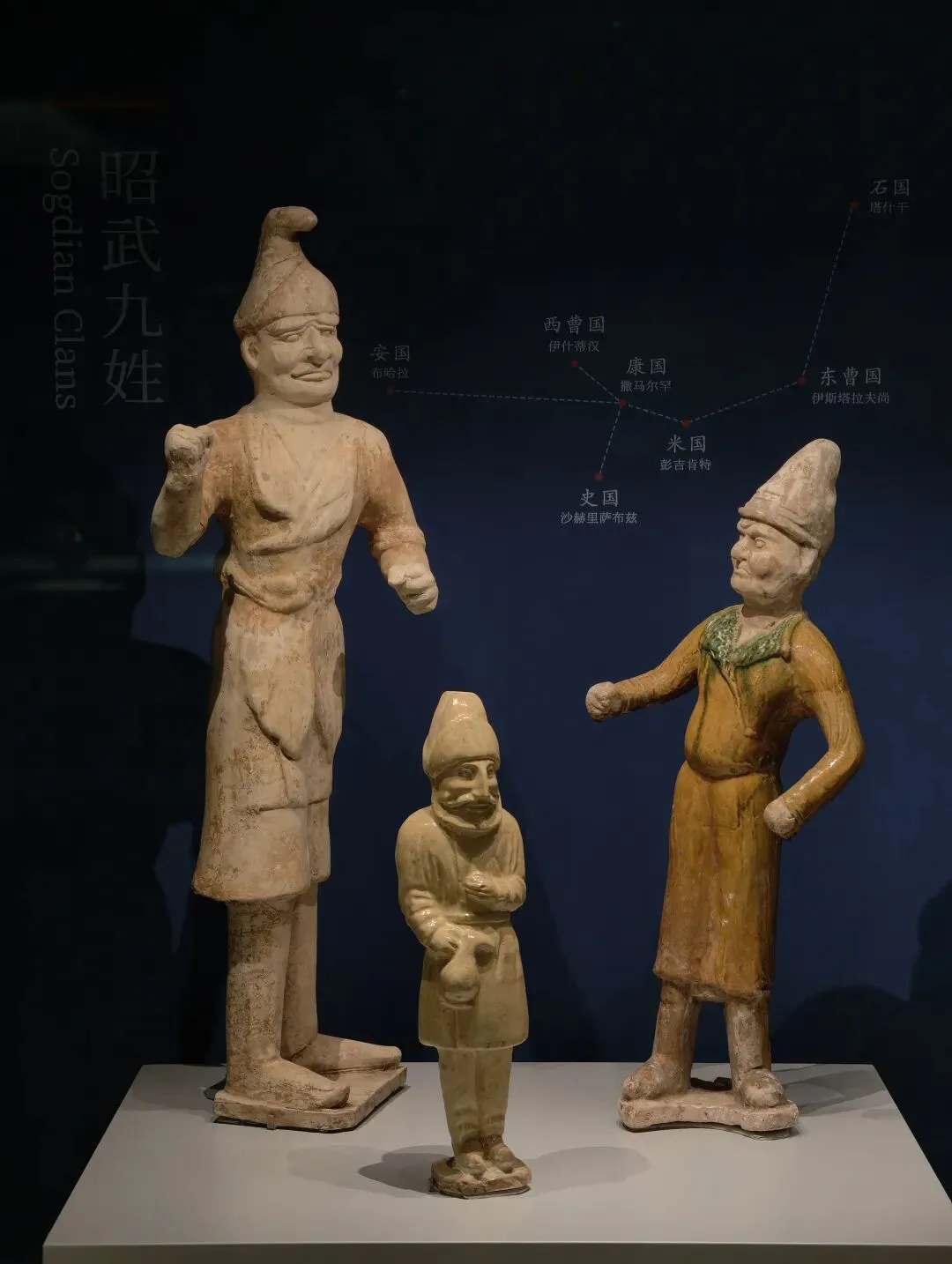 陶俑中高鼻、深目,穿着胡服,入华贸易或从事服务业的族群,主要来自以粟特为首的中亚绿洲国家。自北朝至隋唐,他们赴中国经商、定居,多以原藉国名为姓,史称昭武九姓,包括安、康、曹、米、史、何等。