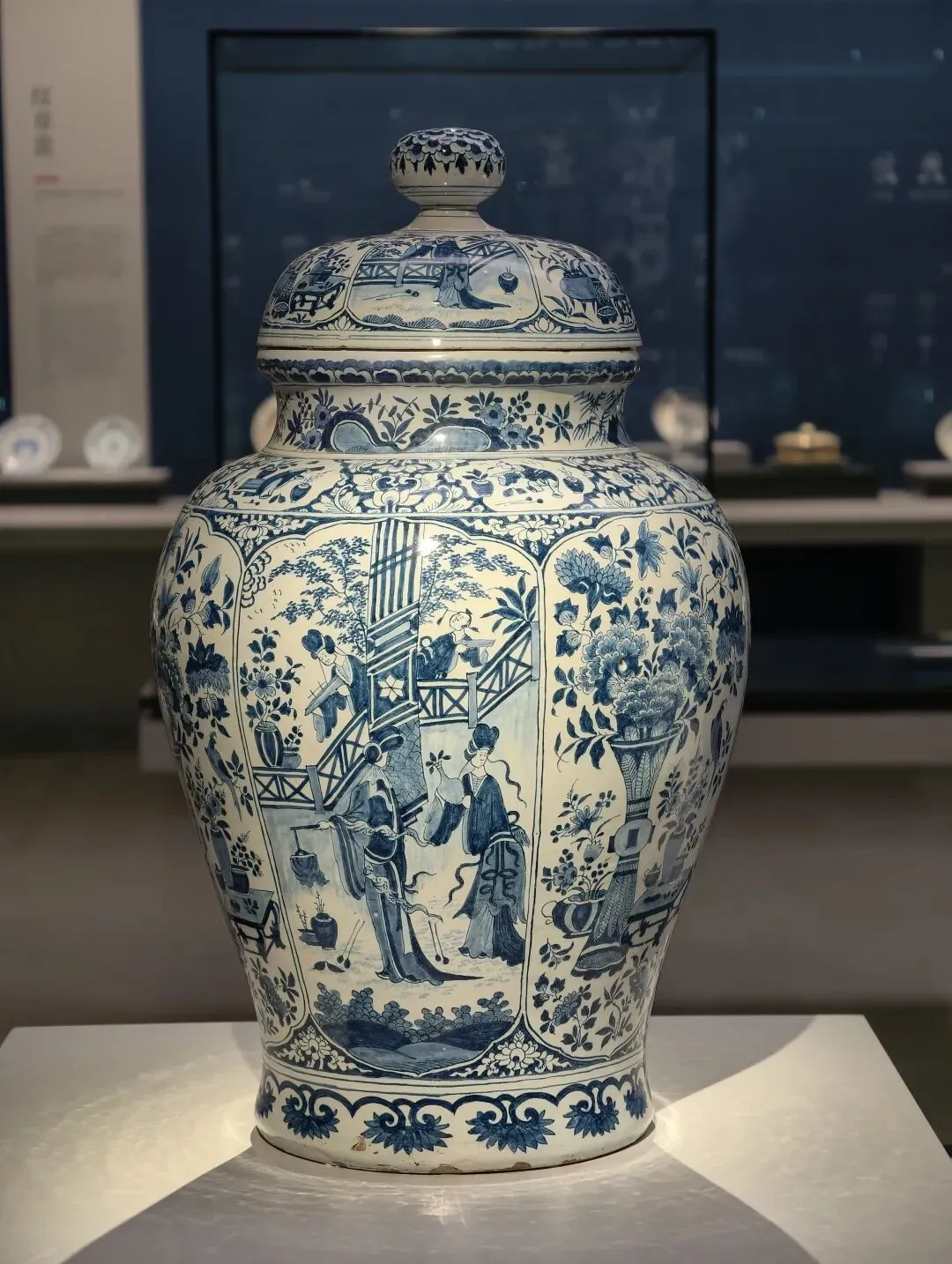16 世纪初,欧洲南部的工匠迁移带来锡釉陶技术的传播,荷兰代尔夫特在 17 世纪中期成为欧洲制陶中心。由于荷兰东印度公司大量进口中国瓷器,代尔夫特工匠可以很方便地获取范本,他们在白色锡釉上再覆一层透明釉,使釉面更显光滑,模仿瓷器的洁白莹润,“代尔夫特蓝” 因此声名远播,畅销欧洲。