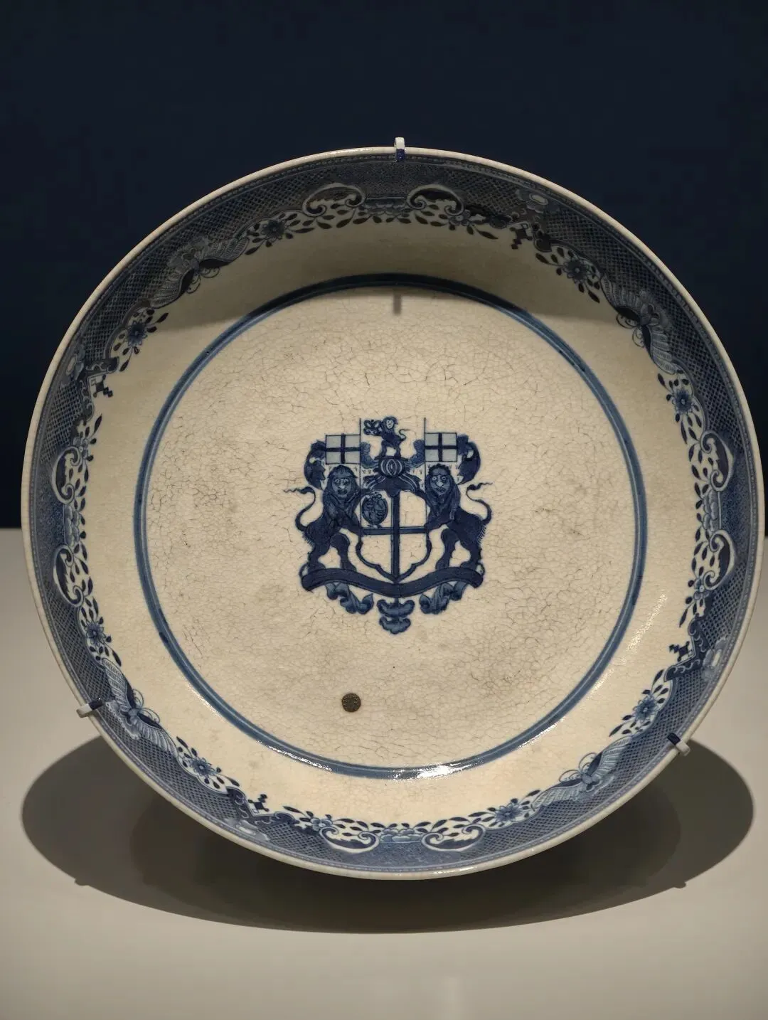 盘心绘英国东印度公司徽章。英国东印度公司成立于 1600 年,女王授予其印度贸易王室特许。1698 年,国会建立平行公司,1702 年两家公司合并。18 世纪,英国东印度公司成为中欧贸易主导者。这件瓷盘应该是英国东印度公司在华订制的整套餐具中的一件。
