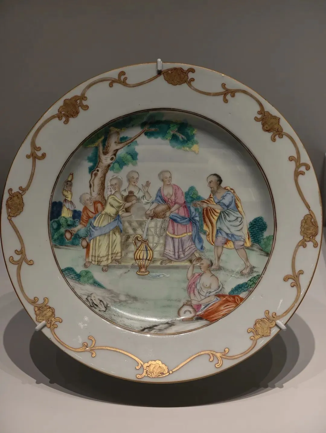 瓷盘中央描绘圣经故事 “井边的利百加”。亚伯拉罕希望他的儿子以撒能娶一位贤良的妻子,便派遣仆人寻找。仆人在井边停留,祈祷以撒未来的妻子能够出现。祈祷得到了回应,善良的利百加给仆人和骆驼取水,之后便成为以撒的妻子。
