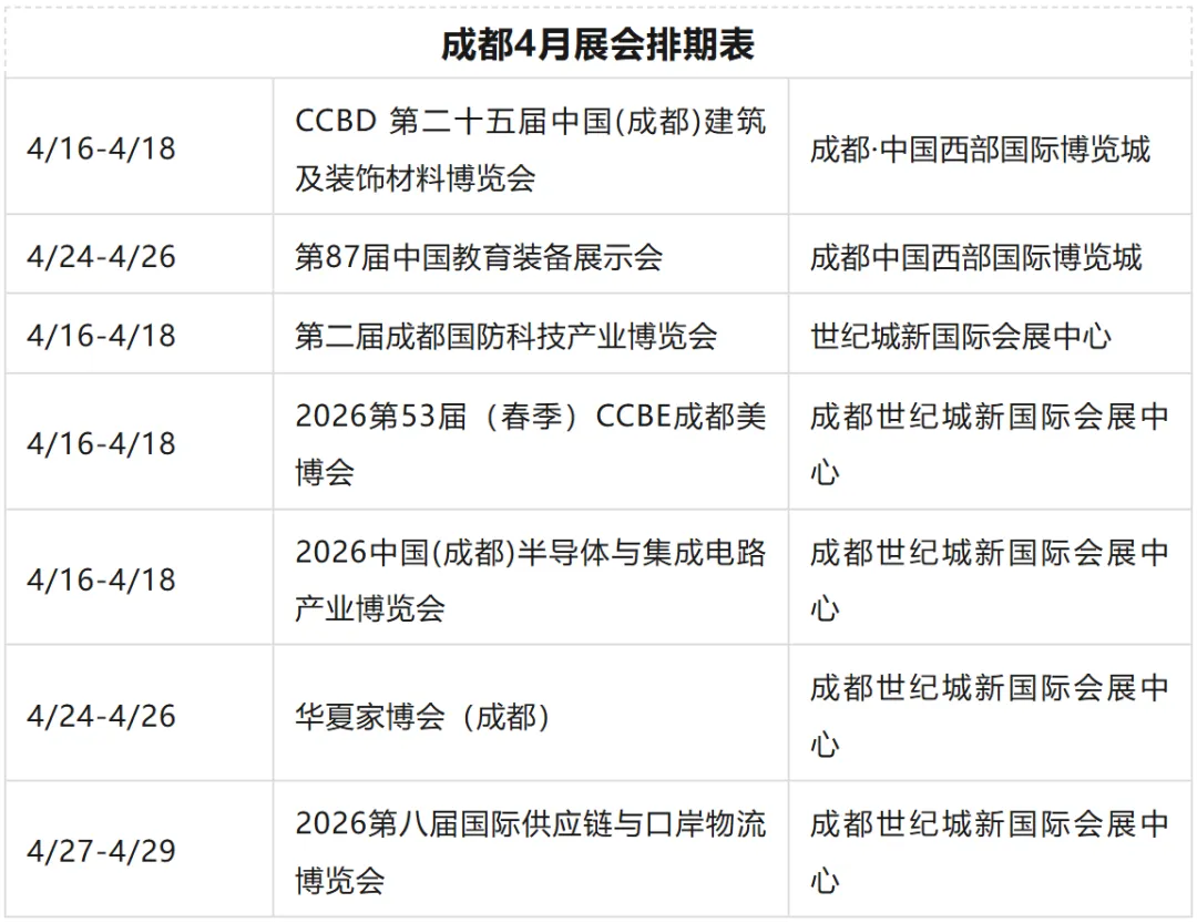 2026成都4月13-30日展会排期表新鲜出炉,专业人士快快收藏起来备用!无论您是想开拓视野、还是寻找商机,快来看看有适合您的展会吗?