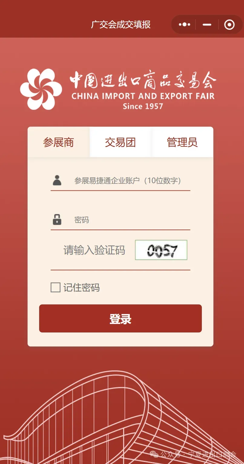 (二)在小程序登录页面,参展商凭参展易捷通账户、密码登录填报。