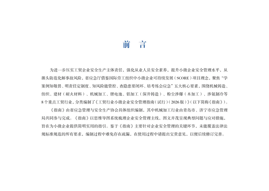 山东省应急管理厅《工贸行业小微企业安全管理指南(试行)》(2026年版)机械加工,文末可下载