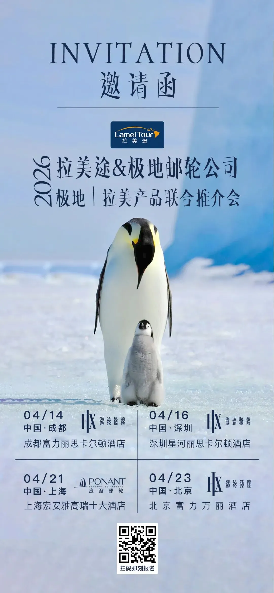 本次推介会阵容强大:HX海达路德游轮探险 与 法国庞洛邮轮(PONANT) 将分别作为成都、深圳、北京站及上海站的核心合作伙伴重磅亮相,共同为中国同业伙伴带来最新极地与拉美旅游产品解读及行业趋势洞察。
