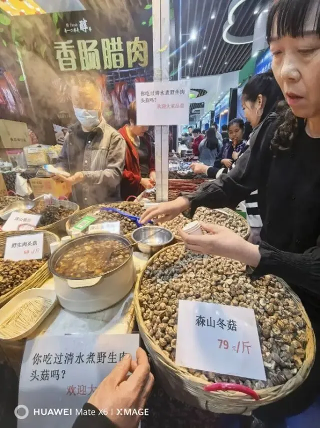 一听口音这个女老板就是东北人,她热情地让我拍她家展示的产品,非要让我尝一尝水煮野生肉头菇,你别说小小的肉头菇放到嘴里,香菇那种独特的香味直冲味蕾,一口下去满口生香呢。想让自家的好东西走出去,那就先让人走出去,思想走出去。东北展销菇类的女老板说出了心里话,这几年经济不好,没办法,千里迢迢出来到各地“取经”。