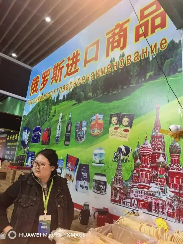 俄罗斯进口商品的展台上放的都是好吃的,赶快来尝尝吧,这位美女在招呼浏览的咱兰陵人。