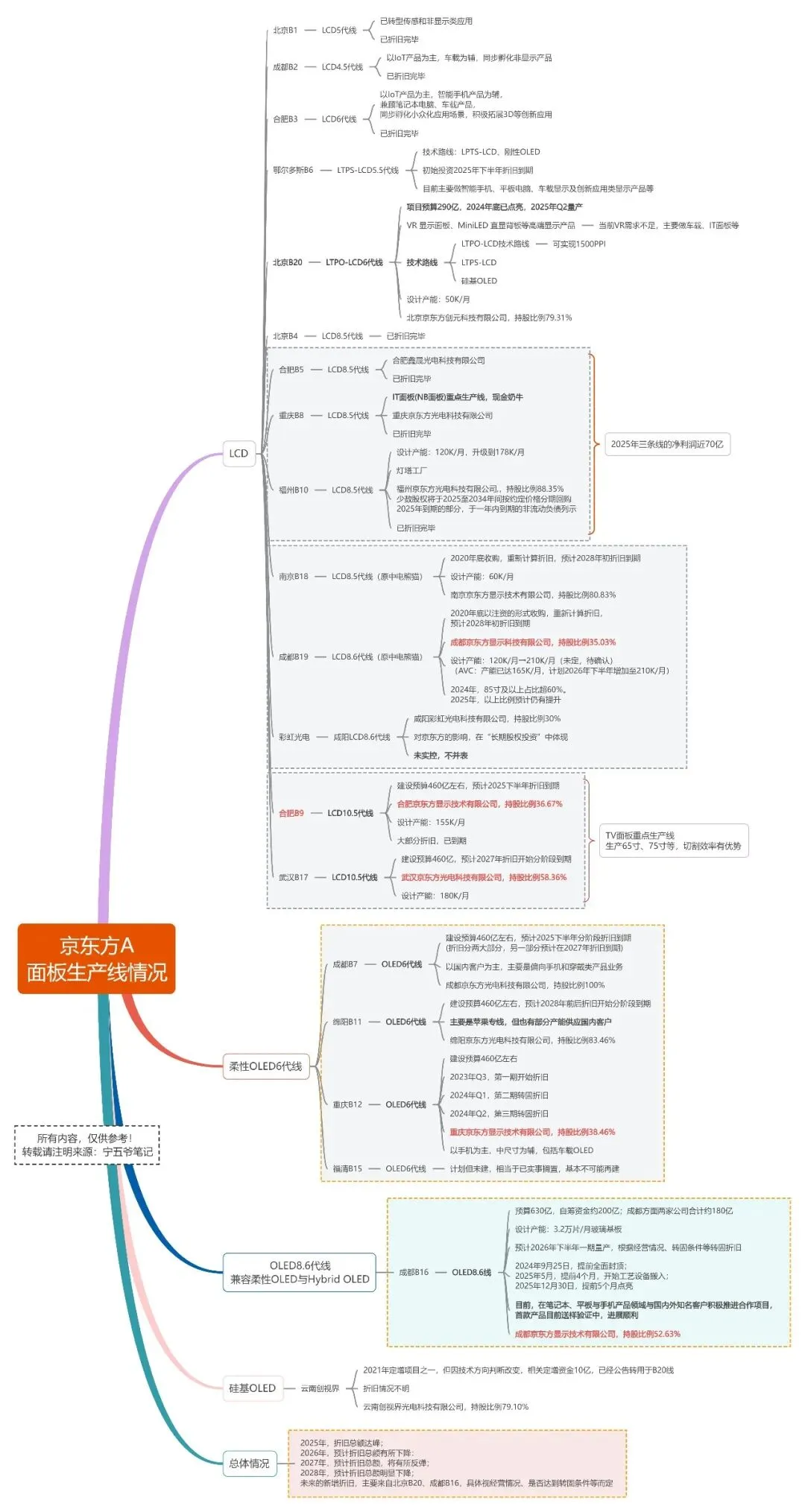 根据最新一些信息,我更新了下京东方A的LCD、OLED生产线情况思维导图,并顺手调整了下结构,优化了下排版,具体如下图所示:一,鄂尔多斯B6、北京B20,我统一调到LCD项目下了,不再单列。其中,北京B20主要是LTPO-LCD、LPTS-LCD的LCD6代线,原计划是主要做VR面板的。但是,VR产品的消费市场,发展太过缓慢了,这几年一直没有出现现象级爆款,总需求处于瓶颈期。所以,北京B20的提前布局,有点太过超前了。我的理解,北京B20,一方面,现阶段主要做车载面板、IT面板,这部分技术成熟、市场成熟,更容易起量。另一方面,就是联手下游品牌商,继续推动VR产品,继续等待VR面板的风口。北京B20的主要折旧,2025年还没有开始,应该是在等产能爬坡,实际开始折旧的时间,可能还要往后推。二,福州B10,LCD8.5代线,京东方持有的股权比例,小幅上升到88.35%。这部分少数股权,是有明确约定回购时间、方式的,京东方有赎回义务,属于特殊的债权,归类到“其他非流动负债”。三,成都B16,OLED8.6代线,预计2026年下半年一期量产。目前,在笔记本、平板与手机产品领域与国内外知名客户积极推进合作项目,首款产品目前送样验证中,进展顺利。2025年,折旧总额达峰;