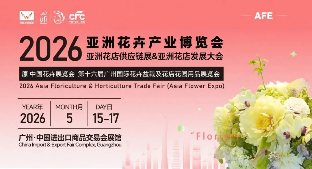 2026亚洲花卉产业博览会、亚洲花店供应链展&亚洲花店发展大会(AFE2026)将于2026年5月15-17日在广州·广交会展馆举办。本届博览会将吸引 600+ 国内外优质品牌企业,全景呈现覆盖花卉种苗、盆栽、鲜切花、花店用品、园艺资材、花艺设计等全产业链创新成果。