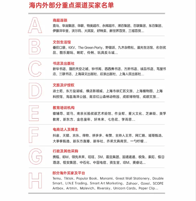 - 国内重点买家:盒马、KKV、名创优品、新华书店、新东方等商超、文创生活馆、书店及教育机构。