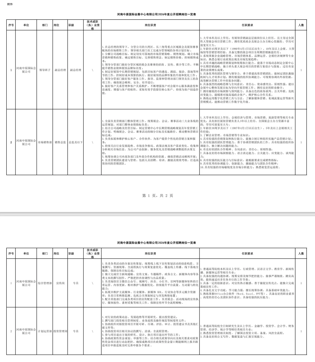 2.岗位要求:各岗位年龄、具体工作职责、任职要求等详见《河南中原国际会展中心有限公司2026年度公开招聘岗位一览表》。