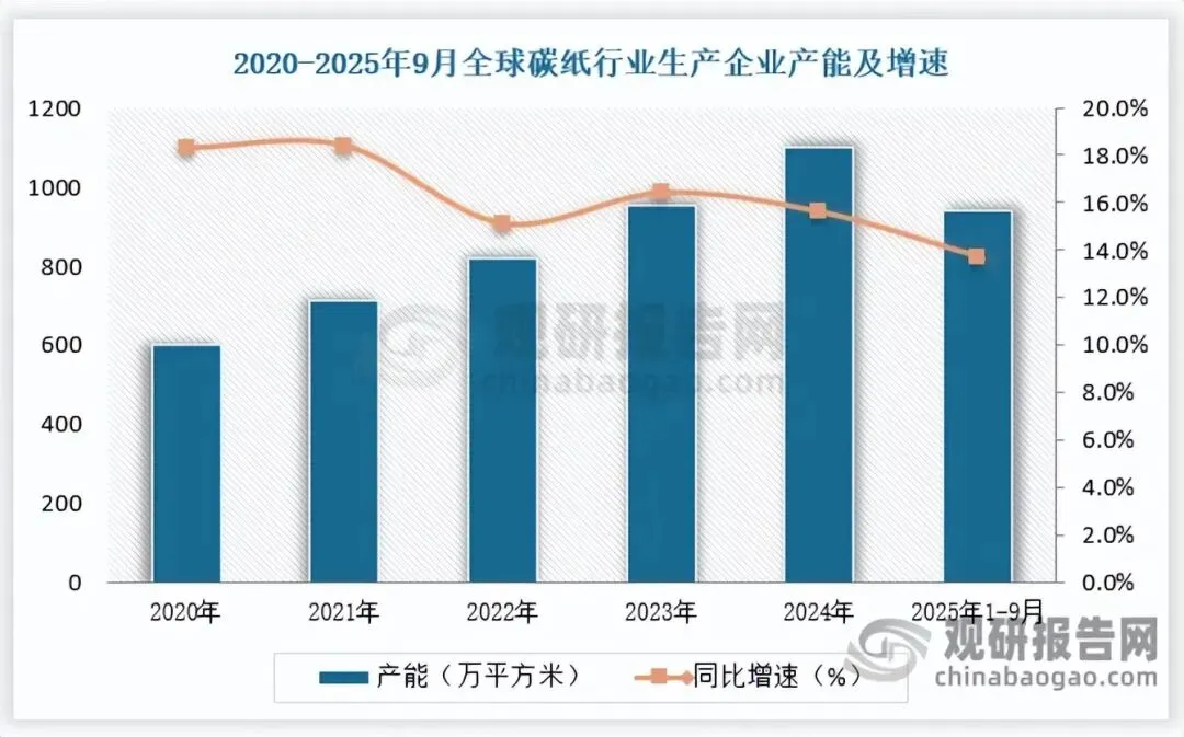 随着燃料电池、电解水制氢及储能电池等下游场景的快速发展,碳纸产能增长的动力持续释放。数据显示,2020-2024年期间,全球碳纸行业生产企业产能从599.22万平方米稳步增长至1098.82万平方米,实现显著提升。截至2025年9月,全球碳纸行业生产企业产能达到937.02万平方米,同比增长13.7%,延续了行业增长态势。