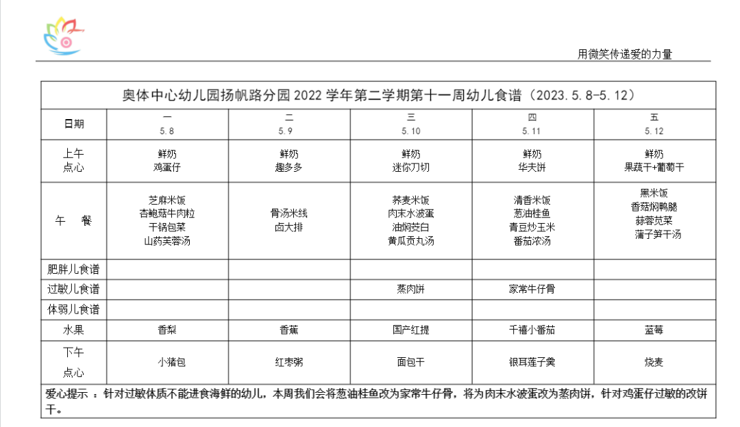 奥体中心学前教育集团遵循科学的幼儿营养结构,给幼儿营造饮食与健康教育为一体的就餐氛围,将幼儿就餐习惯、养成教育、饮食文化融入日常。同时在食谱制定上,针对体重超标儿、过敏儿、体弱儿等幼儿在个别菜品上实行个性化照顾餐,只为让孩子们吃得健康、吃得营养。