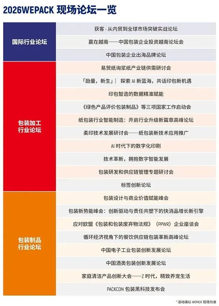2026 WEPACK世界包装工业博览会(World Expo of Packaging Industry 2026),将于2026年4月15-17日在深圳国际会展中心(宝安新馆)举办。展会包含华南国际瓦楞展、中国国际彩盒展、华南国际数字印刷技术展、华南国际新标签技术展、华南国际纸展、植物纤维及食品包装制造技术展、中国包装容器展八大主题展,展会规模持续扩大,展品品类不断丰富。