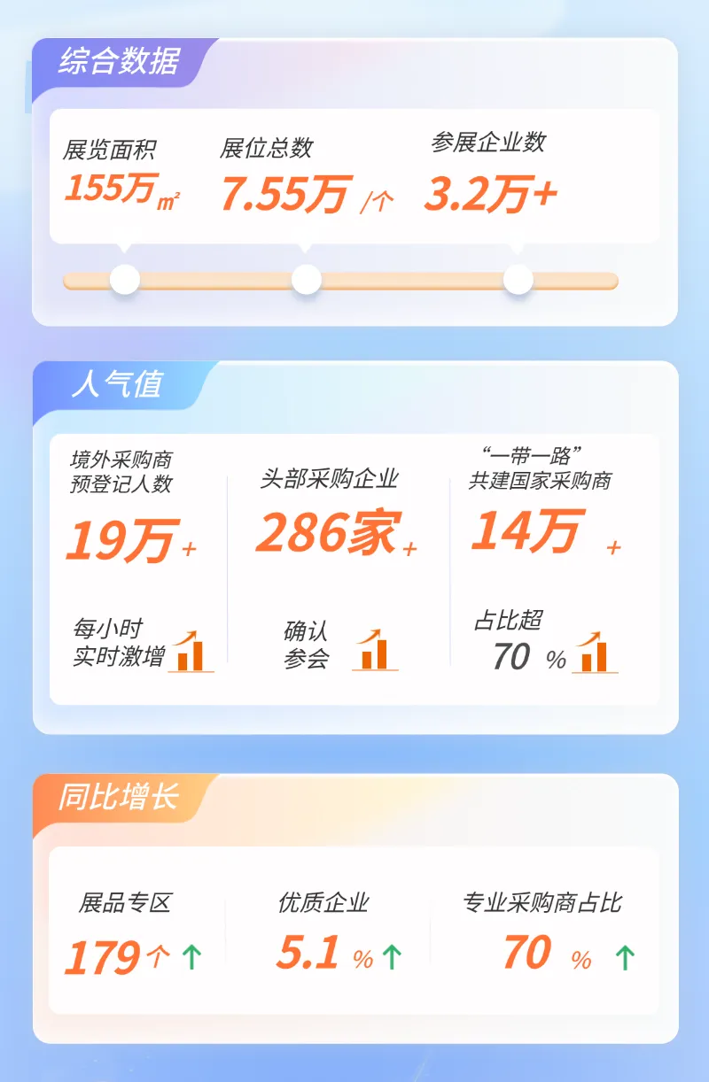 预登记破纪录:境外采购商预登记人数已冲破19万,且数字随开幕临近仍在每小时实时激增。