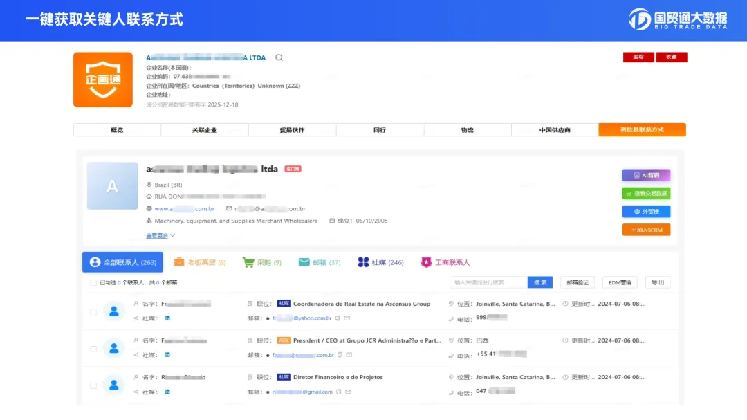 筛选完之后,可通过“外贸搜”一键获取相关企业的联系方式,如采购负责人、高层的邮箱、WhatsApp、LinkedIn等社媒账号。通过“外贸邮”自动过滤无效地址,让你一键触达核心对接人。