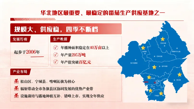 作为赤峰设施农业的红色金字名片,“赤峰番茄”产业起步于2006年,历经多年深耕发展,现已成为内蒙古果蔬产业的标志性品牌,更是华北地区最重要、最稳定的番茄核心生产供应基地。