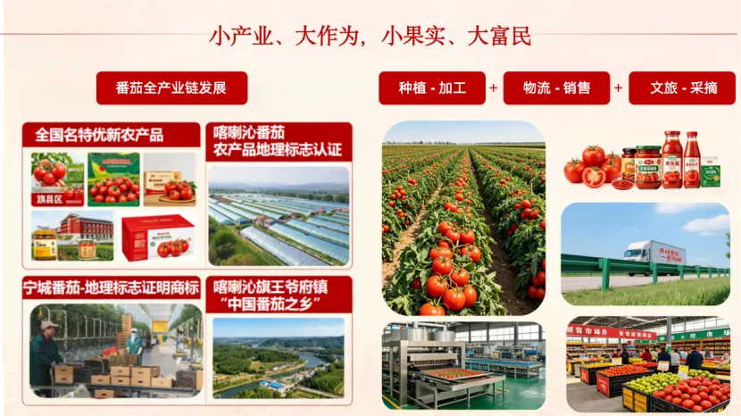 在产业发展上,“赤峰番茄”已形成种植、加工、物流、销售、文旅采摘于一体的完整产业链,番茄酱、番茄汁等深加工产品不断丰富,产业附加值持续提升。