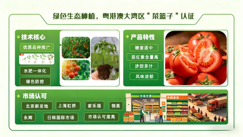 目前,“赤峰番茄”常年播种面积稳定在40万亩以上,年产量达295万吨,年产值成功突破百亿元大关。凭借糖度适中、茄红素含量高、沙甜多汁、风味浓郁的独特品质,“赤峰番茄”成为北京新发地、上海虹桥等大型农产品批发市场免检产品,是家乐福、物美、永辉等连锁超市直供基地,并获得粤港澳大湾区“菜篮子”认证,产品畅销全国,远销日本、韩国等国际市场,市场认可度与品牌美誉度持续攀升。