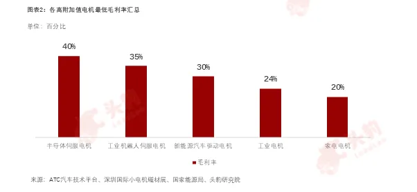高附加值电机涉及复杂的设计制造与材料选择,相比低压电机,高附加值电机有较高的技术门槛,因此利润率和附加值也更高。如半导体伺服电机的毛利率最低可达40%,工业机器人伺服电机毛利率为35%,远高于一般的工业电机和家电电机的毛利率。