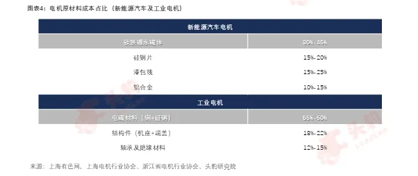 新能源汽车电机的核心需求是 “高功率密度、轻量化”—— 钕铁硼永磁体是永磁同步电机的核心材料,其作用是提升能效、缩小体积,因此占比最高,2023年钕价上涨18%;铝合金则是为了降低电机重量,适配汽车的轻量化要求。