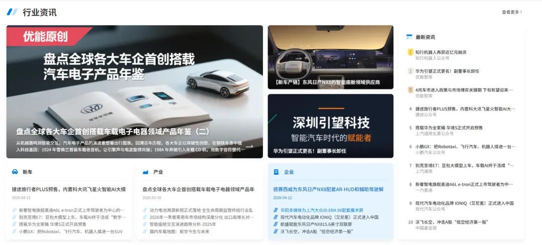 本周,优能智库网三大板块同步上新,精准覆盖行业动态、产业链纵深、企业战略核心需求。行业资讯聚焦新能源、智能制造、新材料等赛道,速递政策导向、技术突破、市场格局变化,提炼高价值趋势与风险信号。产链智库新增多份深度研报,拆解上下游供需、技术迭代、成本结构,覆盖储能、氢能、有机硅等热点领域,为产业布局提供数据支撑。企业智库聚焦龙头动态、资本运作、技术布局,收录标杆案例、经营分析、竞争格局研判,助力把握企业发展脉络与投资机遇。全维度内容兼具时效性与专业性,为决策提供高效参考。本周行业资讯更新24篇,其中有盘点全球各大车企首创搭载车载电子电器领域产品年鉴(二)、智能汽车时代:软件定义汽车,谁来定义软件?、2026年一季度乘用车市场结构深度分化 出口高增长对冲内需压力、动力电池溯源新规正式落地 全生命周期监管终结行业乱、4月中下旬起 汽车实体按键强标即将实施、【新车产链】东风日产NX8的智能座舱领域供应商、德赛西威为东风日产NX8配套AR-HUD和辅助驾驶解决方案、华阳多媒体为上汽大众ID.ERA 9X配套魔术屏、航盛赋能东风日产NX815.6英寸双联屏、轻舟智航量产版图再扩容,21款新车型稳步密集交付中、镁佳科技为NX8智能座舱提供整体解决方案、赛力斯“车载便器”专利获授权:可隐藏于座椅下方、小马智行在萨格勒布启动欧洲首个商业化Robotaxi服务、图达通官宣:交付量正式破百万、沃飞长空,冲击A股“低空经济第一股”、现代汽车电动化品牌 IONIQ(艾尼氪)正式进入中国、新奢智电旗舰奥迪A6L e-tron正式上市驾驶者为中心的六联屏“数字舞台”,、别克至境E7:豆包大模型上车,车载AI终于活成“数字家人”、小鹏GX:把Robotaxi、飞行汽车、机器人揉进一台SUV、搭载华为全家桶 华境S正式开启预售、捷途旅行者PLUS预售,内置科大讯飞星火智能AI大模型、4月车市进入政策与市场博弈关键期 下旬有望迎来回暖、华为引望正式更名!副董事长卸任、知行机器人再获近亿元融资。本周上新岚图全系车型,包括岚图梦想家、岚图泰山、岚图知音、岚图追光 L 、岚图追光。本周上新企业12个,其中北京天顶星智能信息技术有限公司、江苏长晶科技股份有限公司、深圳市长盈精密技术股份有限公司、电连技术股份有限公司、武汉芯源半导体有限公司、上海瓶钵信息科技有限公司、奕行智能科技(广州)有限公司、辉羲智能科技(上海)有限公司、maxim integrated products, inc.、知行机器人科技(苏州)有限公司、上海易景信息科技股份有限公司、广州鹏辉能源科技股份有限公司。详细信息和想了解更多信息请登录:http://www.yonezk.com/优能智库网(www.yonezk.com)是汽车智能产链检索服务平台,专注于泛汽车智能域控领域,覆盖汽车智能座舱、智能驾驶、智能网联、车载光电、数字声学以及智能外设等最新行业资讯、企业信息服务、车型配置信息等。致力推动汽车智能化行业信息共享、人才共建和资源整合,通过优能智库平台对汽车智能化的专业理解、产业深度和资源聚合的能力,为企业及行业人士提供更快、更新和更有用的信息与服务。