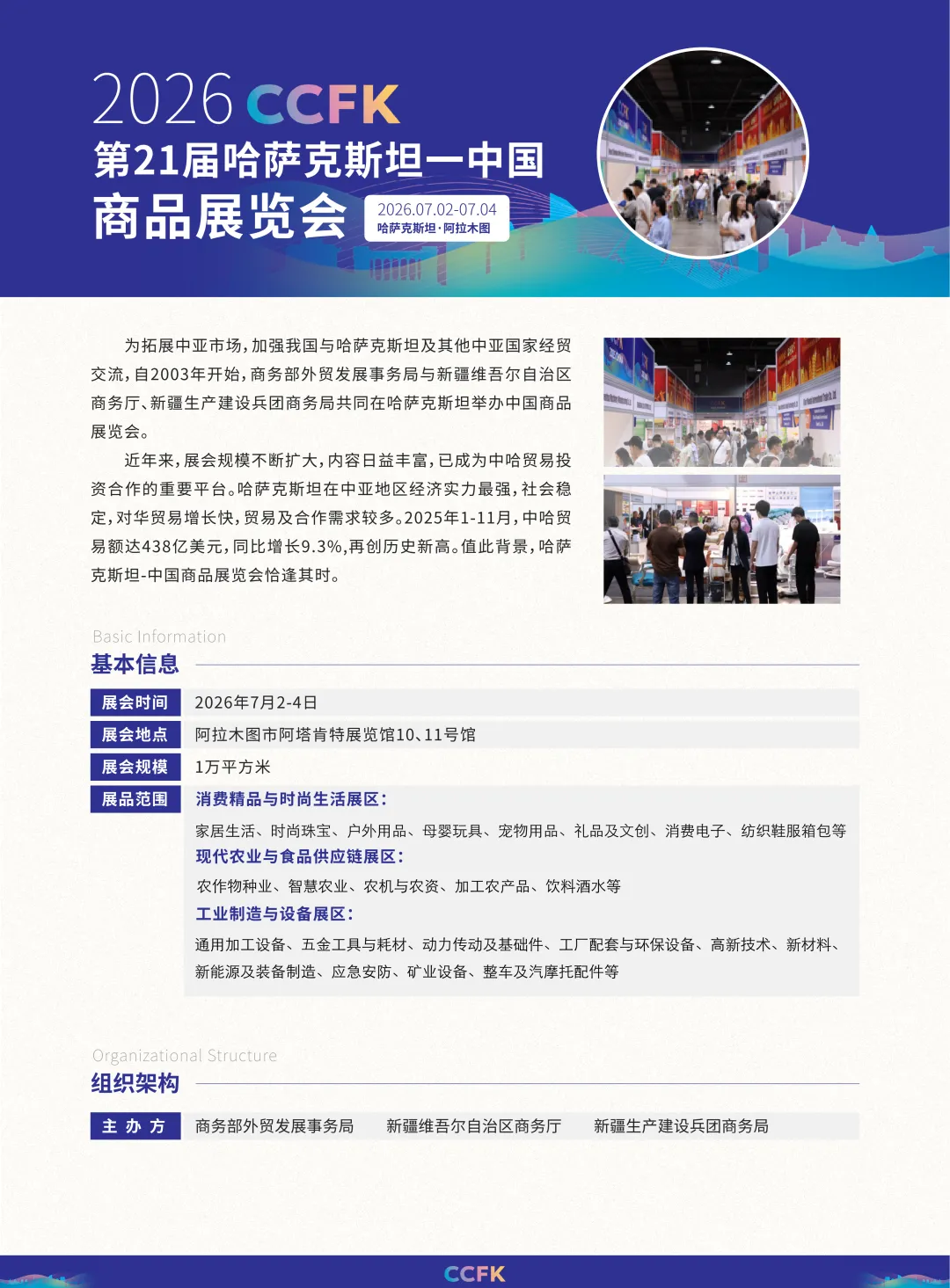 第21届哈萨克斯坦—中国商品展览会将于2026年7月2日至4日在哈萨克斯坦阿拉木图隆重举办,是助力企业开拓中亚市场、深耕“一带一路”沿线经贸布局的国家级官方优质出海平台。本届展会由商务部外贸发展事务局、新疆维吾尔自治区商务厅、新疆生产建设兵团商务局联合主办,展览规模超10000平方米,平台权威、资源雄厚。