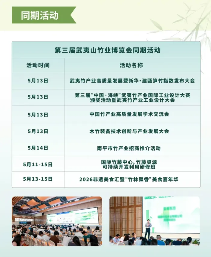以竹代塑,绿色生活。武夷山竹博会,5月13-15日,南平武夷山,邀您共赴这场竹业盛会,一同见证一根翠竹的千亿传奇,共探中国竹产业的无限未来!