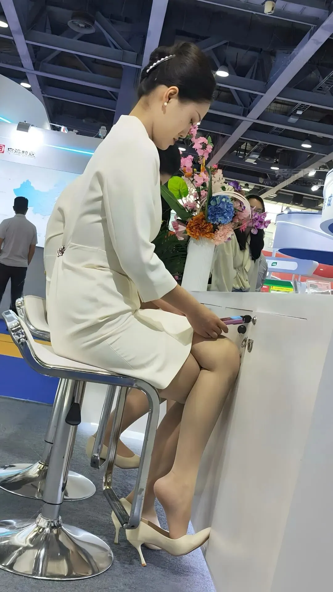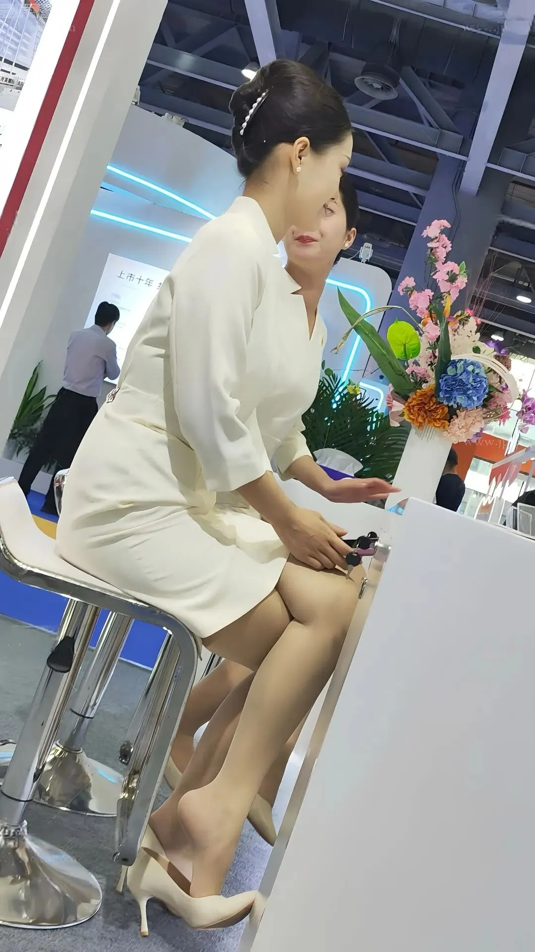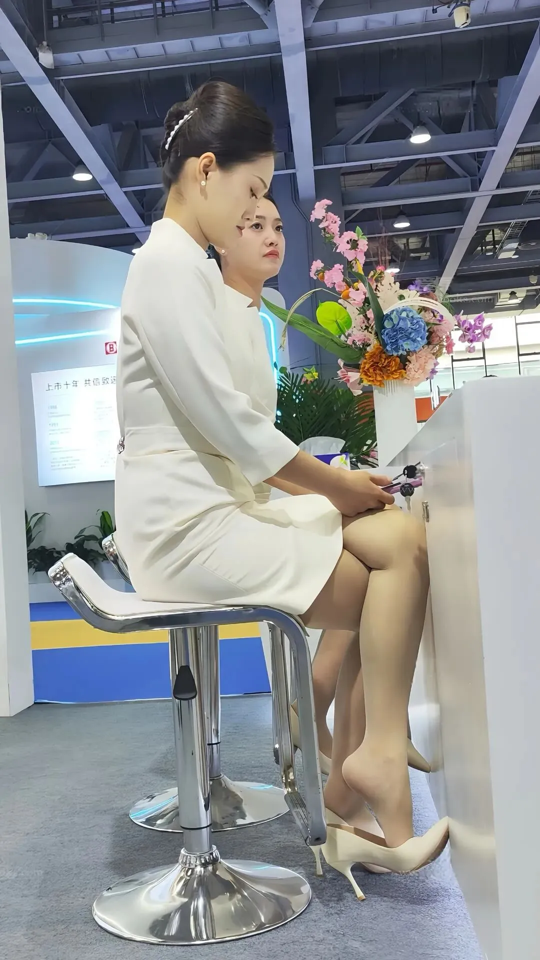 今天逛展会偶然捕捉到心动一幕!两位穿白色连衣裙的小姐姐正专注工作,背影线条超优雅~ 米白色高跟鞋搭配同色系连衣裙,简约又高级,忍不住拍下来分享!