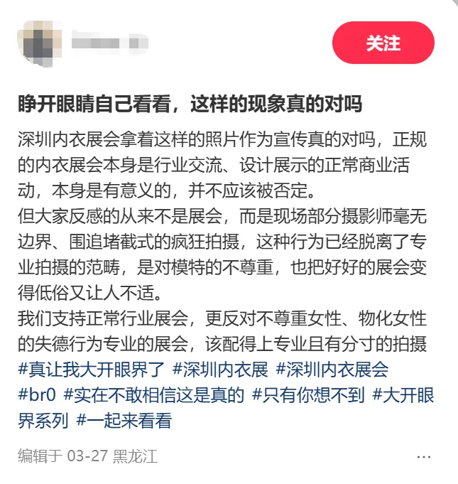 最近,深圳举办了2026年的内衣展会吸引了不少人去参观。然而,有部分集美看到摄影师围着模特拍照后却引起了她们的不满,认为这是不尊重女性,并且认为行为非常的低俗。