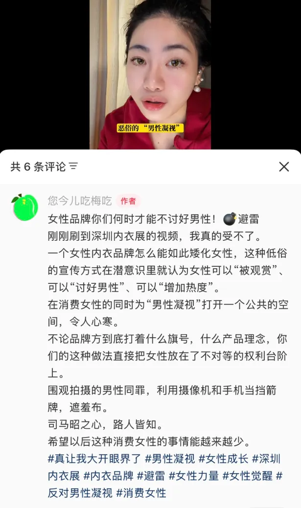 对于这样的脑回路只能说很明显是应激了,内衣展会让模特试穿并拍照本身就是一种很好的宣传方式,只要是正常的逻辑都不会往“不尊重女性”方面思考。