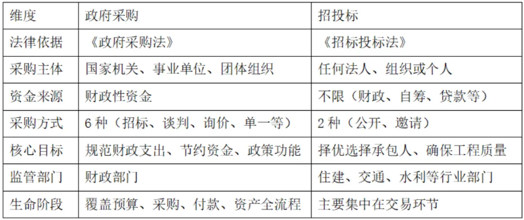 政府采购:主要依据《中华人民共和国政府采购法》及其实施条例。它规范的是“国家机关、事业单位和团体组织”使用财政性资金的行为。