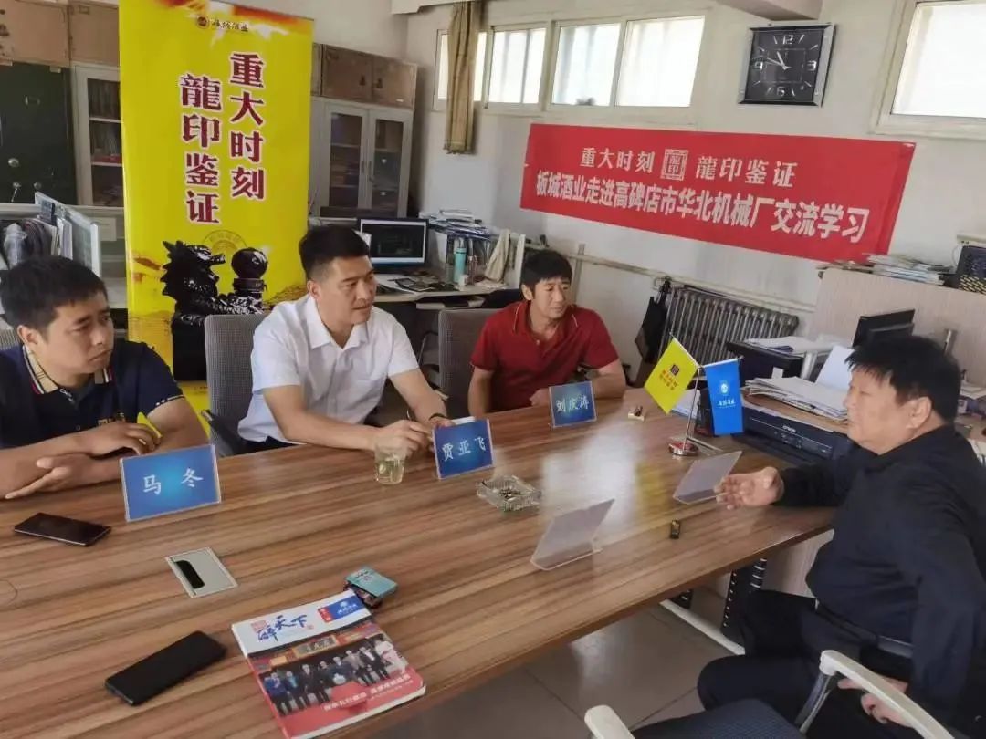 5月7日,板城酒业保定战区区域经理贾亚飞,业务经理马冬,高碑店市昊昕酒业总经理刘庆涛一行共同走进高碑店市华北建材机械有限责任公司进行交流学习。高碑店市华北建材机械有限责任公司总经理韩建新出席接待,并对板城酒业一行的到来表示热烈欢迎。
