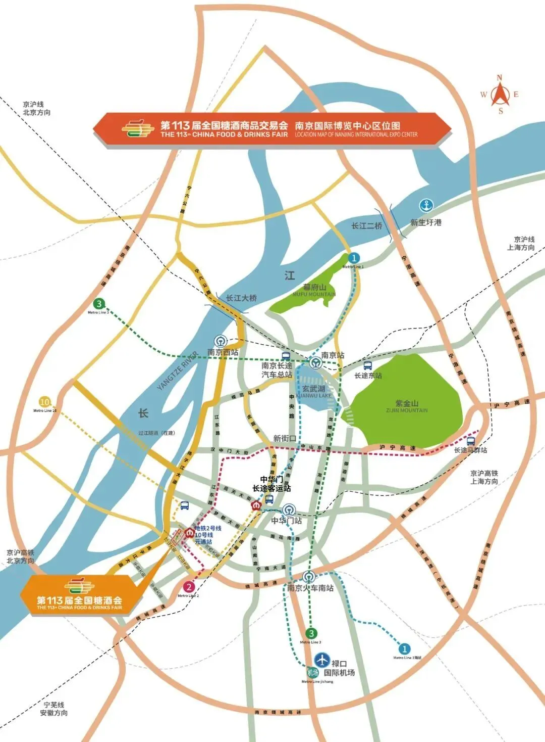 地铁:地铁S1号线禄口机场站→南京南站,换乘地铁S3号线→油坊桥,换乘地铁2号线→元通站,参展观众请从1、4口出站,票价:7元,全程约1小时。