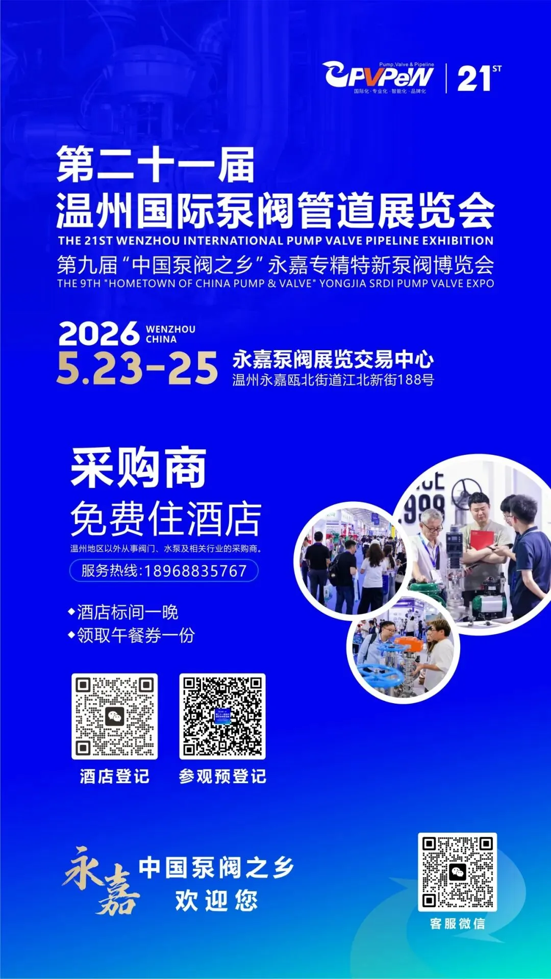 第二十一届温州国际泵阀管道展览会暨第九届“中国泵阀之乡”永嘉专精特新泵阀博览会于2026年5月23-25日在永嘉泵阀展览交易中心召开,本届展会展出面积达30000㎡,设有3大展馆、1150+展位,将吸引数万名专业观众到场观展、洽谈。展品涵盖:阀门及配套产品、智能控制阀、执行机构、各类管道及密封与材料、检测与服务、水泵、智能设备等,覆盖泵管阀全产业链。为行业搭建更广阔的交流合作平台,助力企业拓市场、链资源,是泵阀行业不容错过的年度标杆盛会。