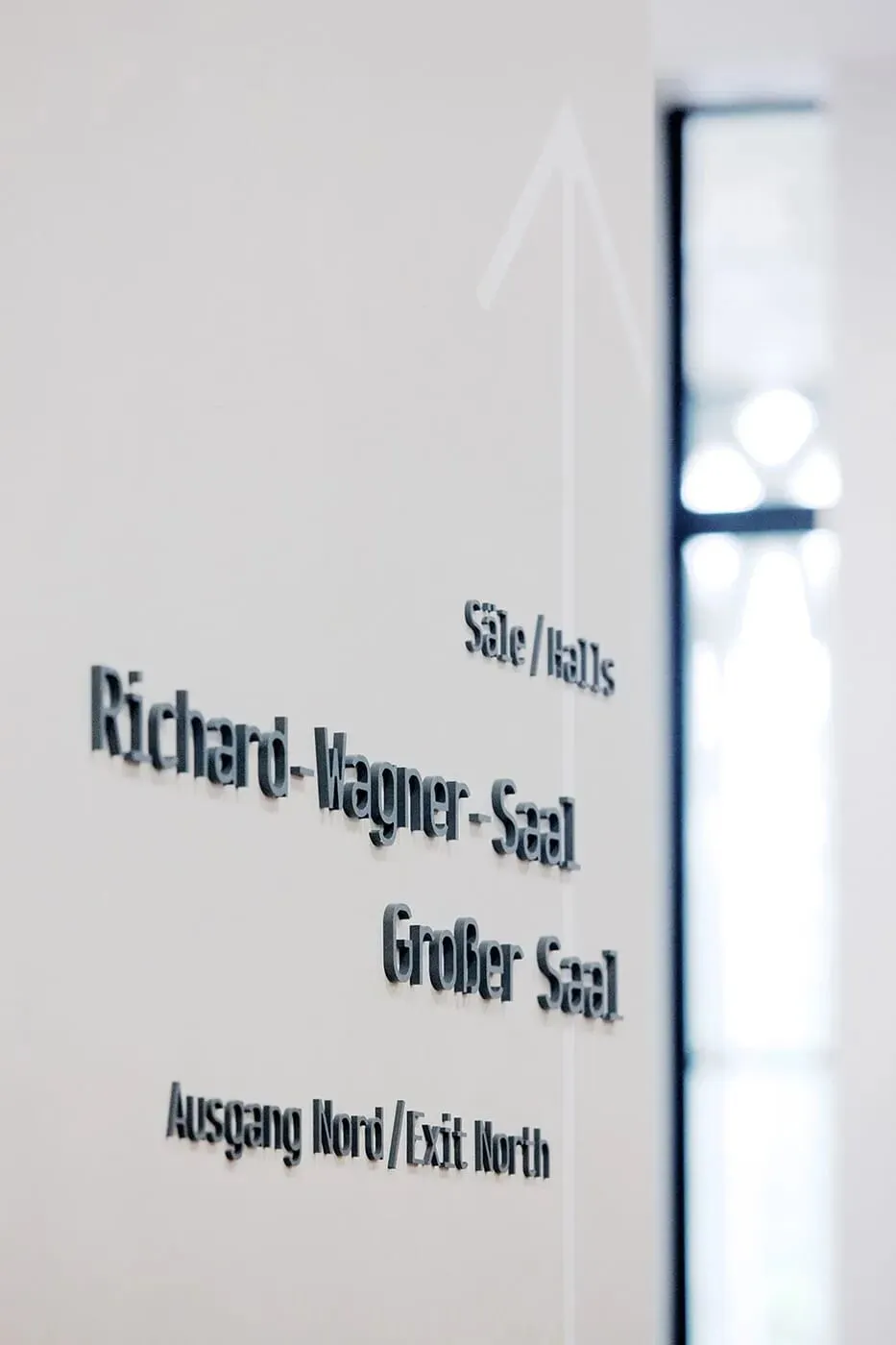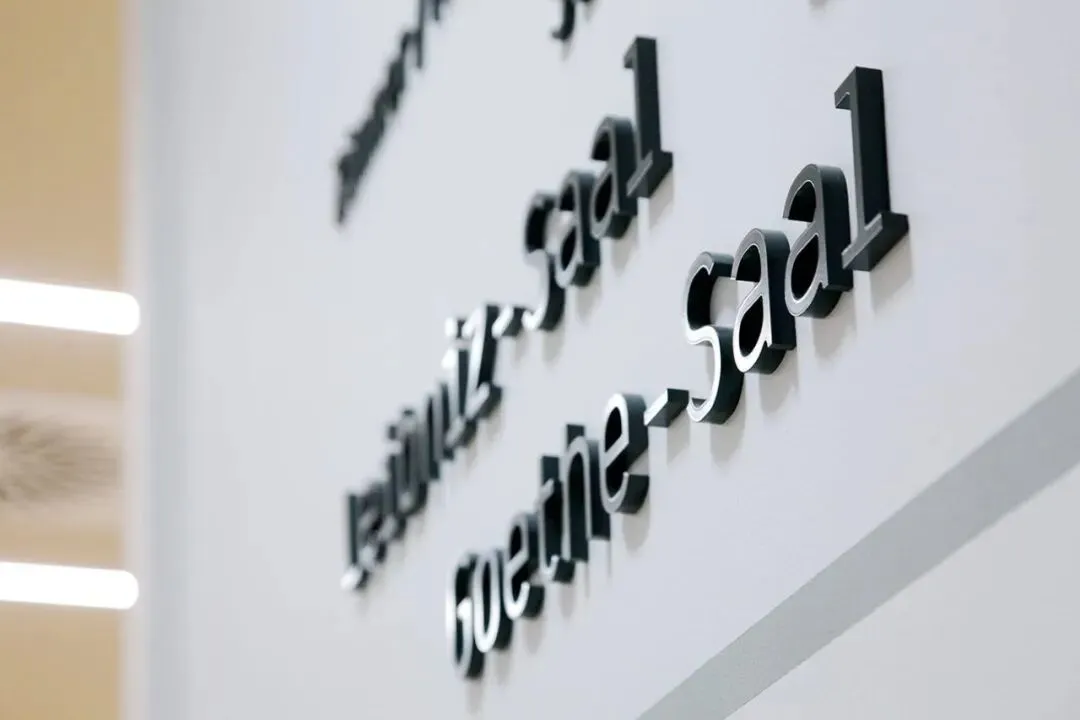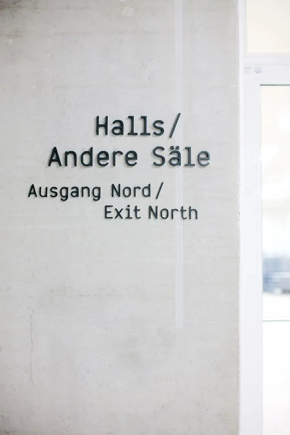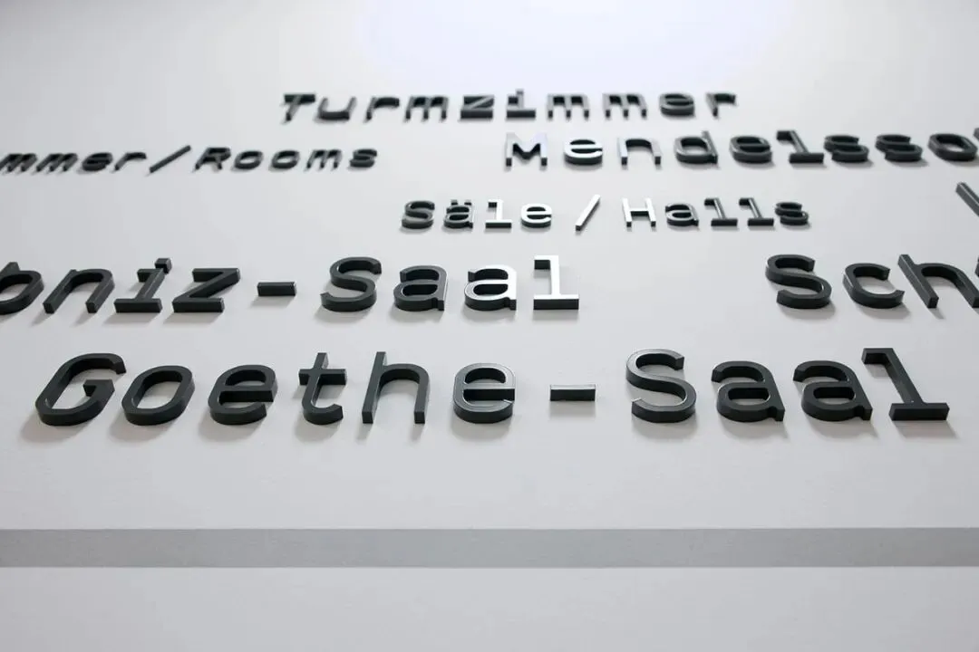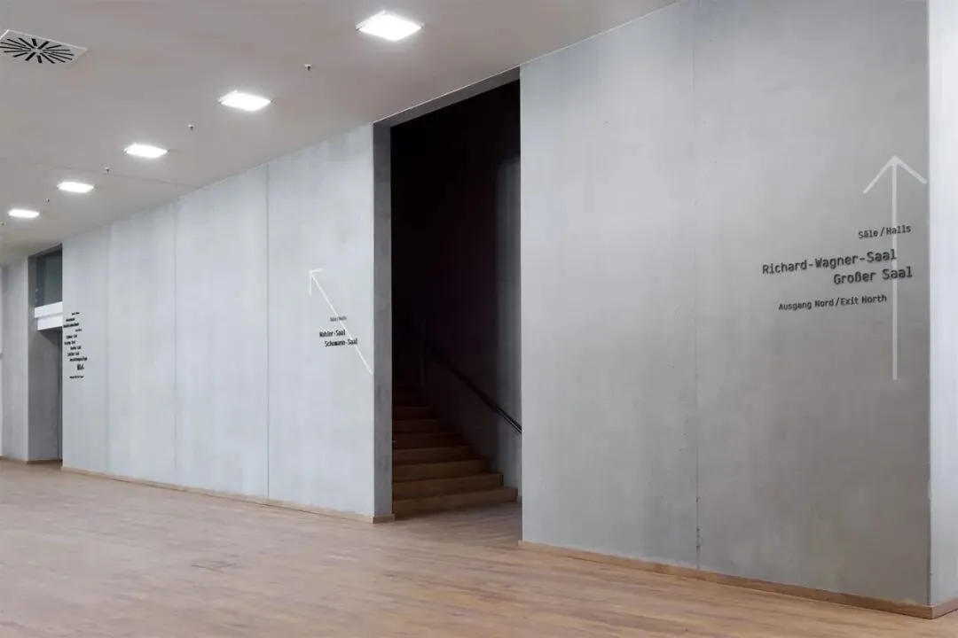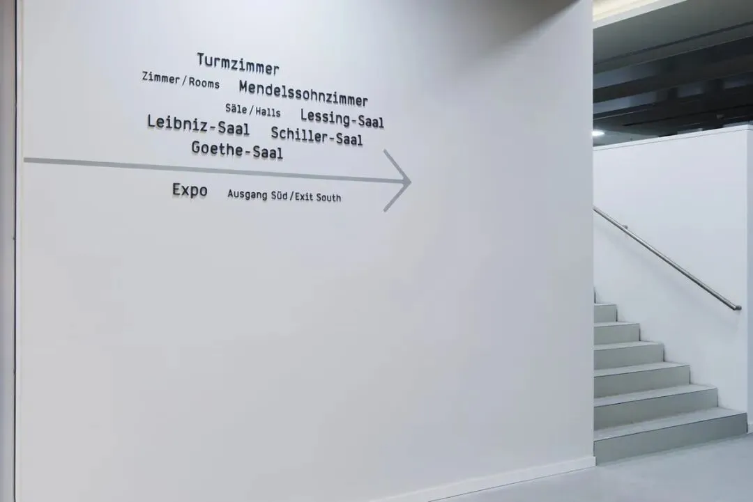 以「少即是多」为核心,用哑光黑立体无衬线字 + 黑白灰基底,打造出高级克制的视觉语言;德英双语对照、清晰的信息层级,让寻路效率拉满;浅灰线条串联动线,完美融入清水混凝土、复古礼堂等多元空间,让导视成为建筑的一部分,而非视觉负担。