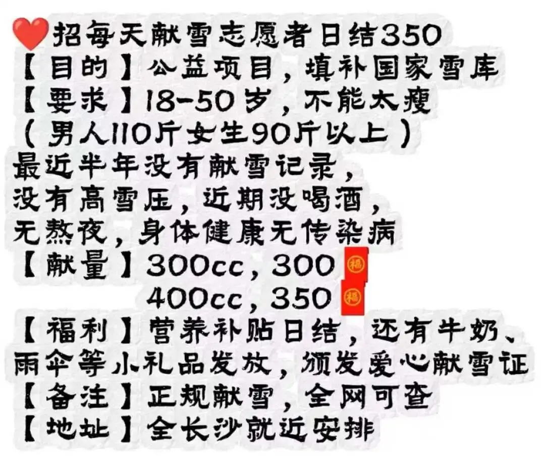 【要求】18-50 岁,女生体重过90,男生过110。最近半年没有献雪记录,没有高雪压,近期没喝酒,无熬夜,身体健康无传染病