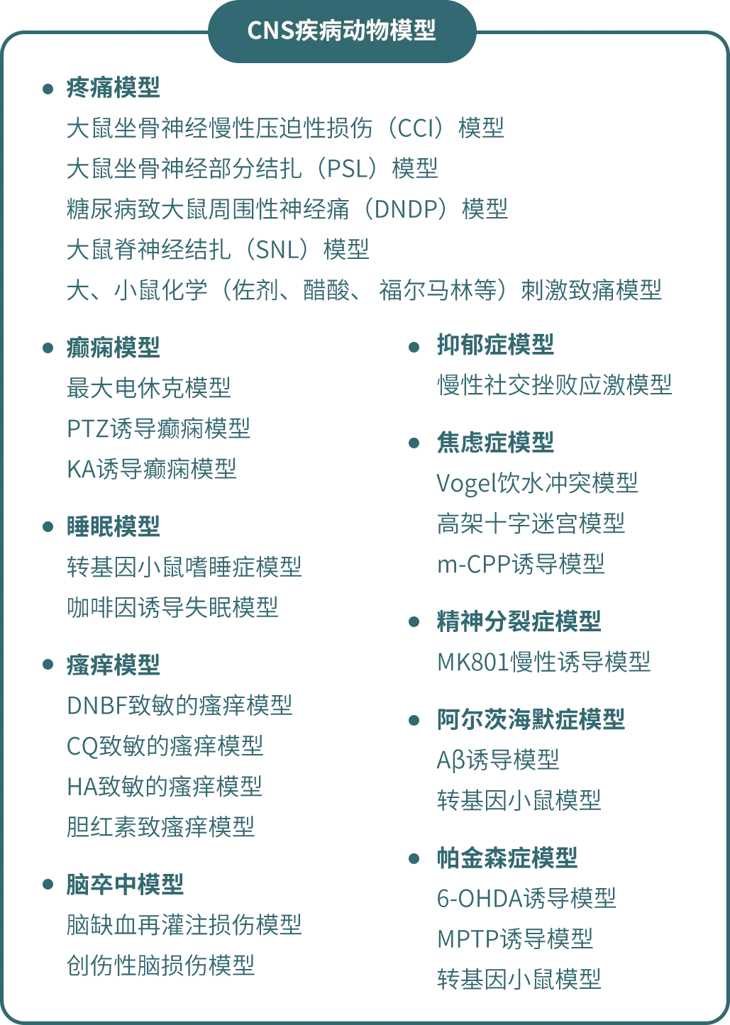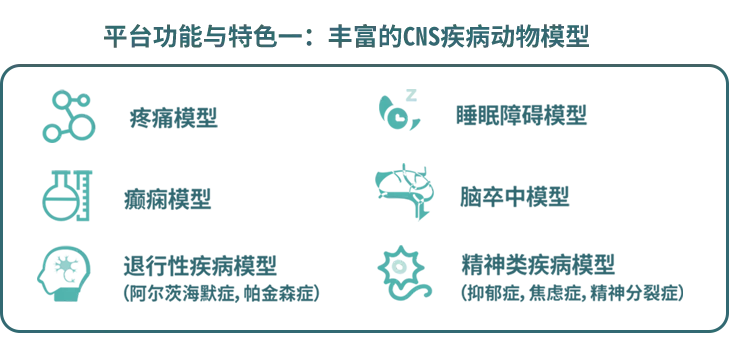 (1)丰富的CNS疾病动物模型:平台以疼痛、睡眠以及癫痫研究为特色优势项目,此外还覆盖抑郁症、焦虑症、精神分裂症、双相情感障碍等神经精神类疾病,阿尔茨海默症、帕金森症等神经退行性疾病,以及缺血性/出血性脑卒中等CNS疾病的动物模型构建。