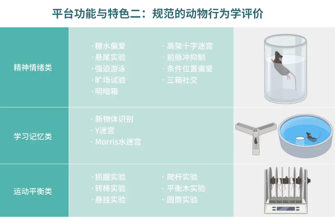 (2)规范的动物行为学评价:平台可开展精神情绪类、社会群体类、学习记忆类、运动平衡类等多种动物行为学测试。