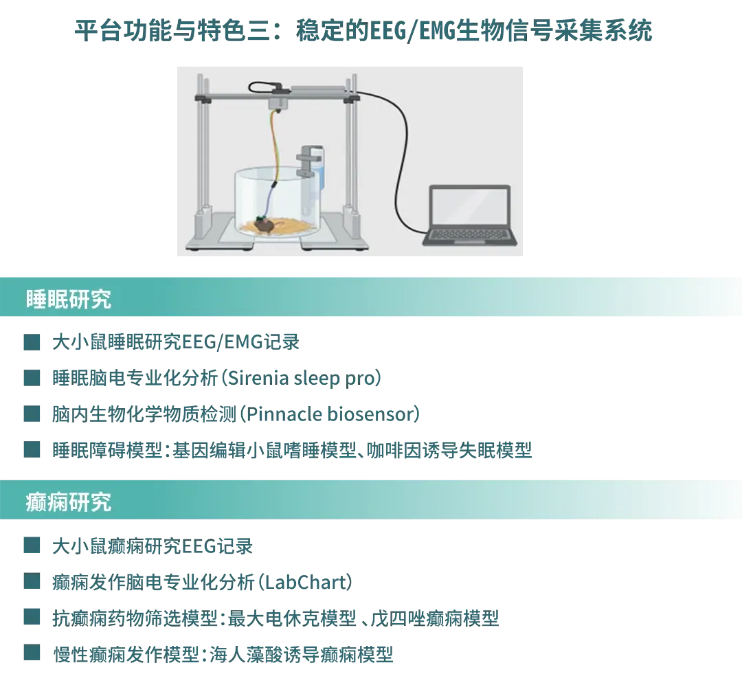 (3)稳定的EEG/EMG生物信号采集系统:本平台提供一站式神经电生理信号采集方案,可实现清醒动物(大小鼠)脑电EEG/肌电EMG/场电位LFP的记录及分析(PowerLab/Pinnacle),也可进行脑内化学物质检测,可开展睡眠相关药物、抗癫痫药物、麻醉药物、精神类药物、激素类药物等需要 EEG/EMG 监测的药效评价研究。