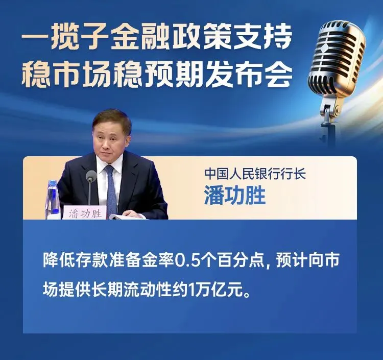 中国人民银行宣布降准0.5个百分点,向市场提供长期流动性约1万亿元,同时下调政策利率0.1个百分点。