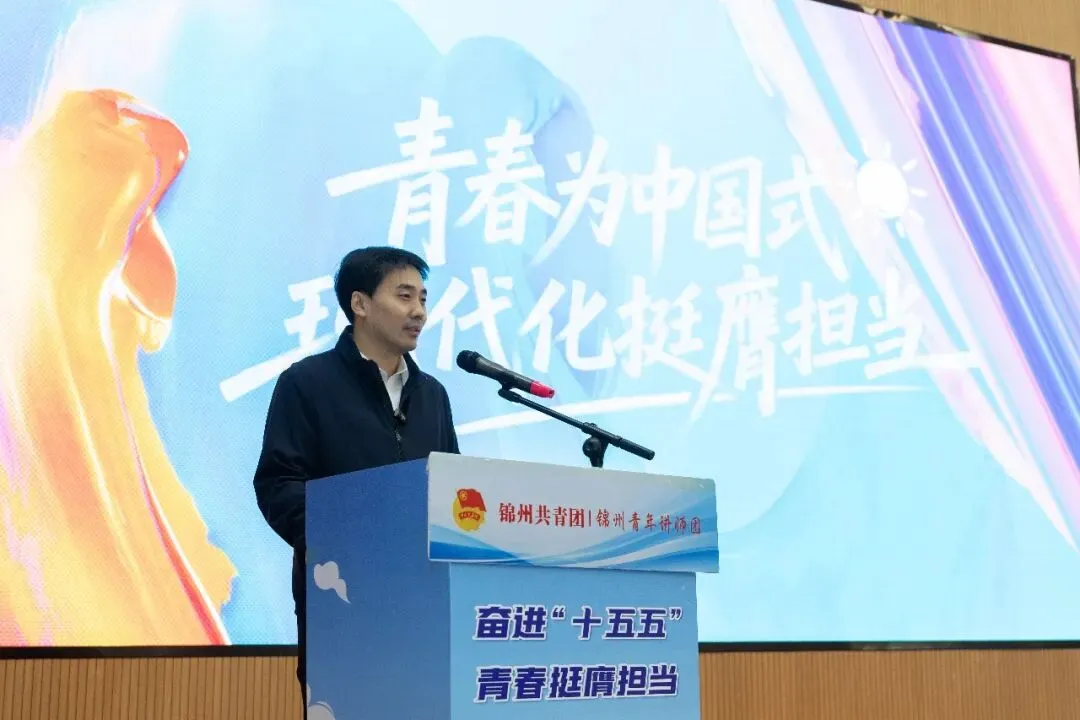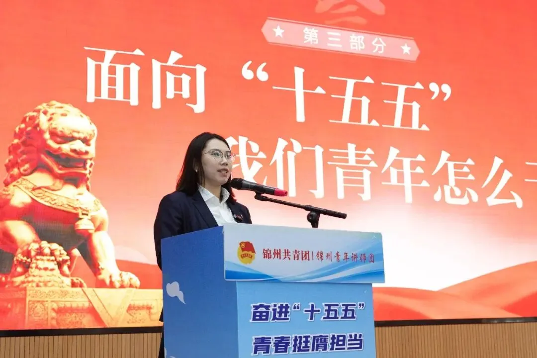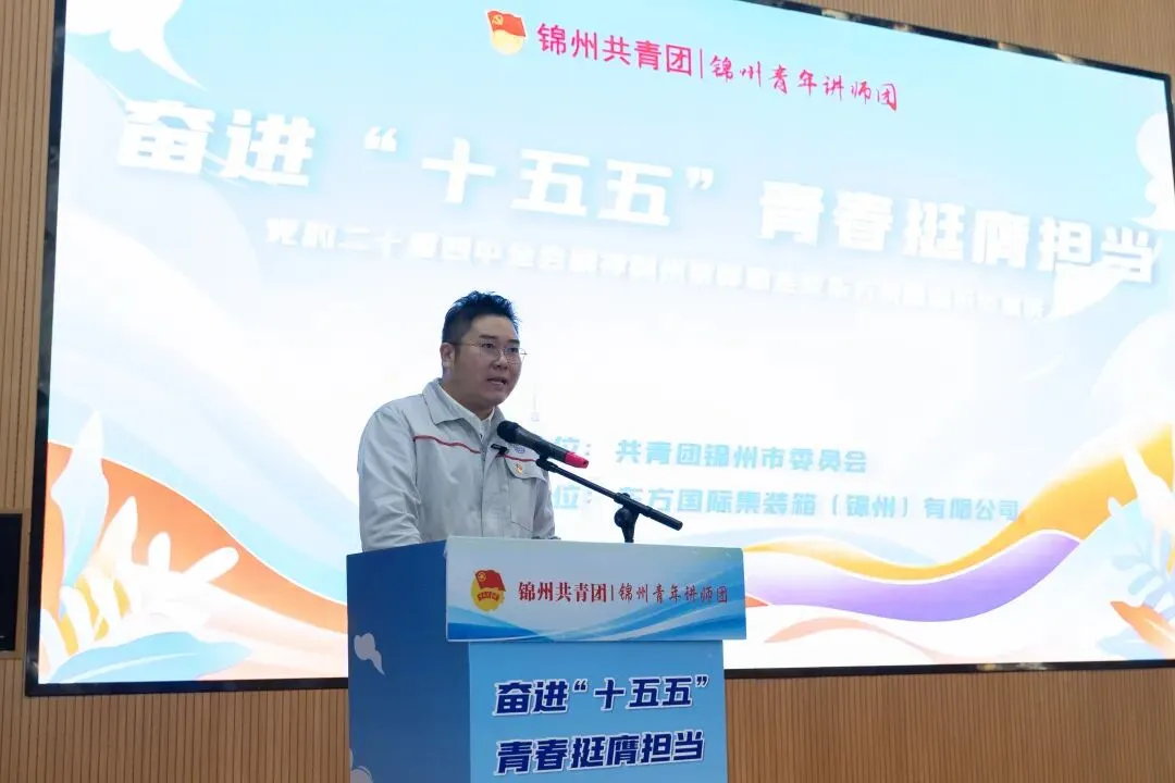 这是由共青团锦州市委员会主办、东方国际集装箱(锦州)有限公司承办的“奋进十五五、青春挺膺担当”示范宣讲活动的现场。百余名身穿工装的青年职工,把车间变成了课堂。
