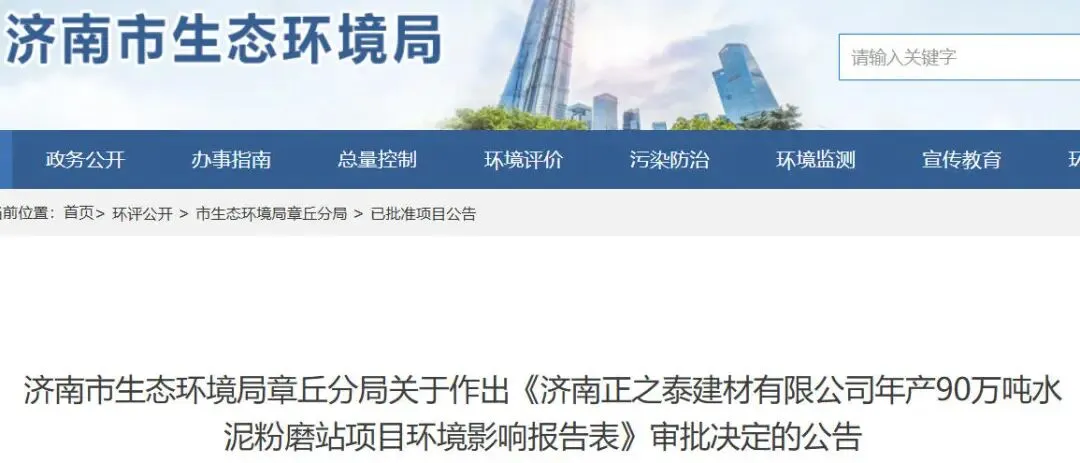 近日,山东省济南市生态环境局章丘分局发布《济南正之泰建材有限公司年产90万吨水泥粉磨站项目环境影响报告表》审批决定的公告。