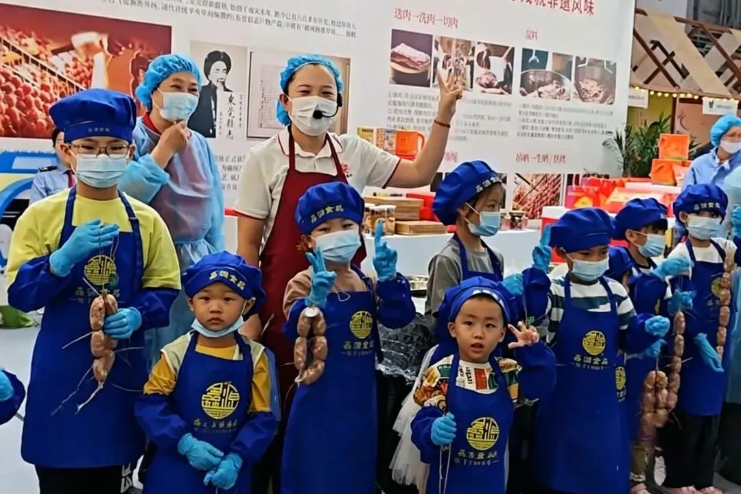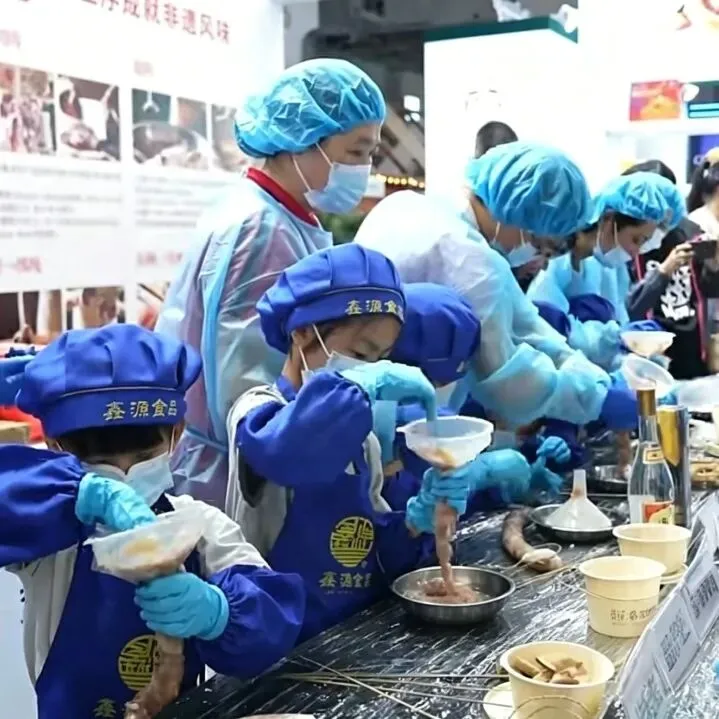 在东莞市鑫源食品有限公司展位,大小朋友们系上围裙,亲手体验制作国家地理标志产品——东莞腊肠