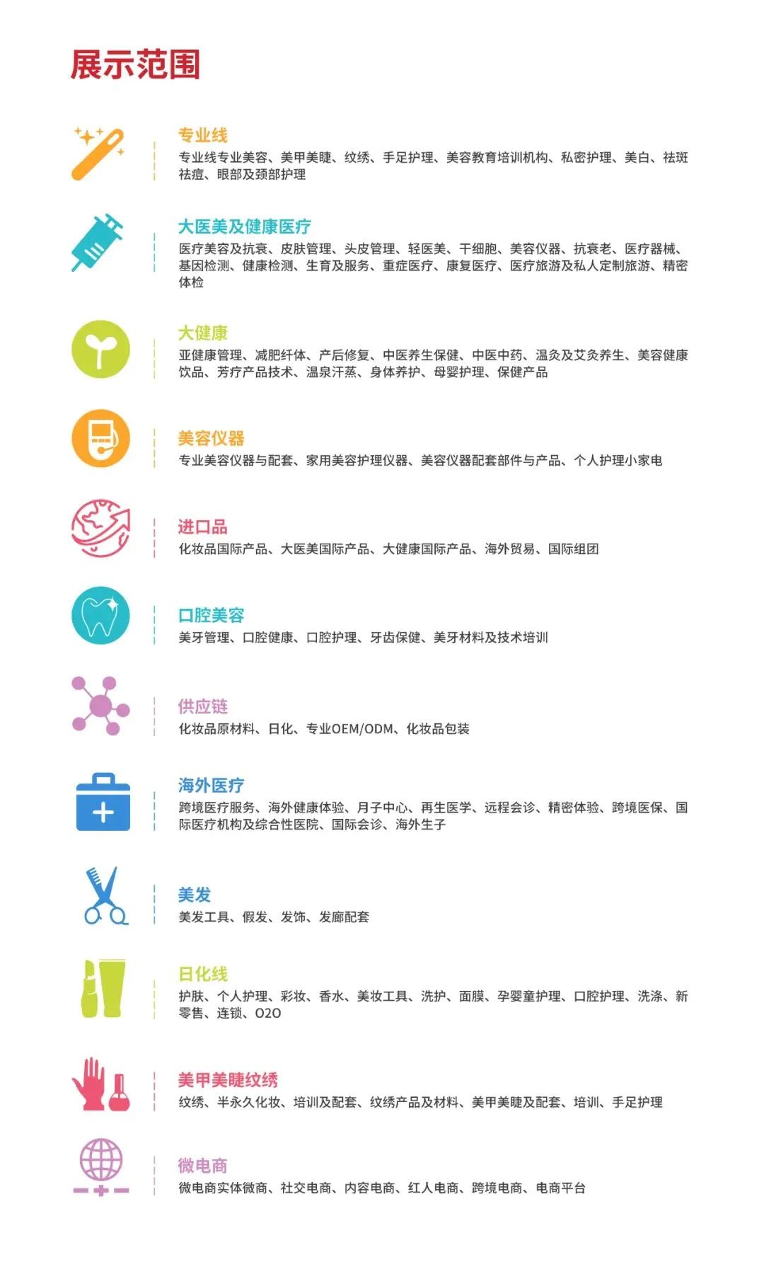 超大的展览空间广聚群链,包含丰富的创新成果+展台活动+互动体验+宠粉福利,日化、供应、专业线、电商与新渠道、跨界板块覆盖全产业链全品类.......为展商和买家提供市场前沿动向,助推优质资源的商机对接。