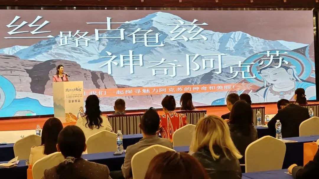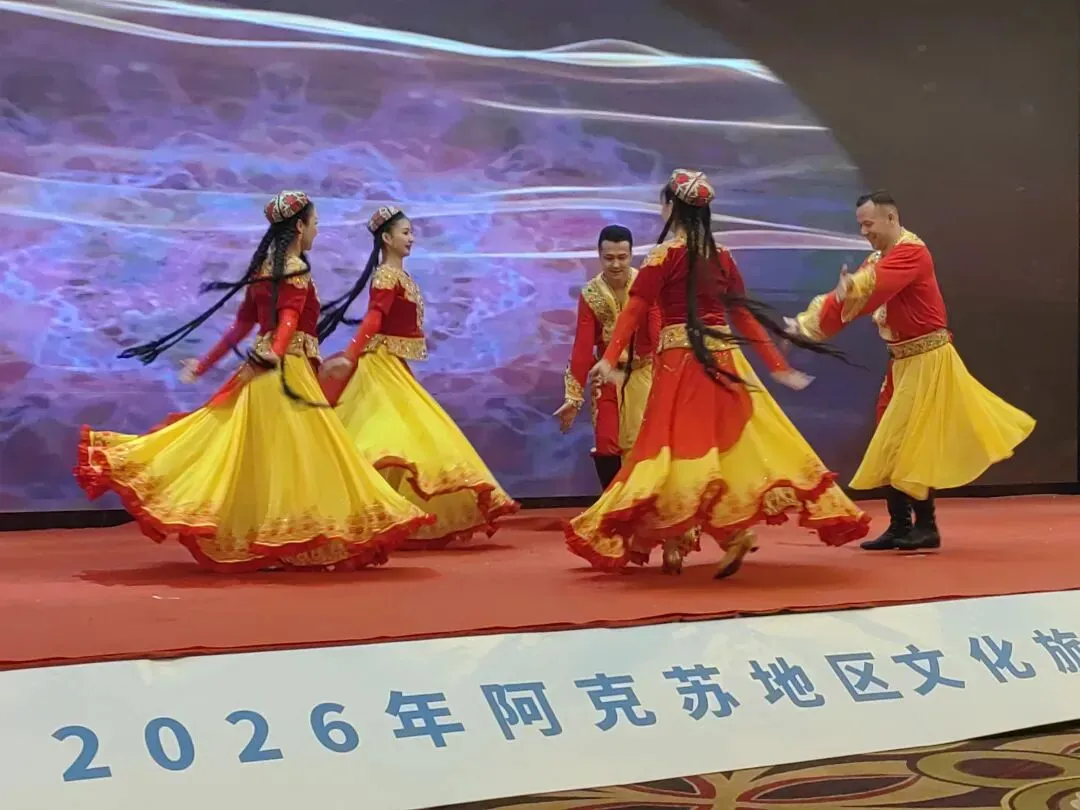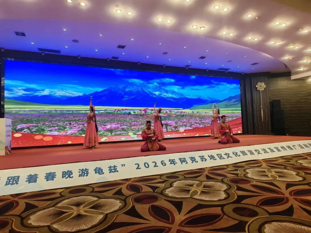 推介环节,阿克苏地区文旅推介官姜娜全面介绍了阿克苏的丝路文化、龟兹遗产、雪山草原等核心文旅资源与重点项目;阿克苏市、沙雅县、新和县、阿瓦提县、柯坪县依次登台,展示各地特色文旅IP。现场穿插《丝路古韵》等新疆歌舞表演,生动演绎龟兹文化魅力,特色文旅产品展销区也吸引了众多嘉宾驻足咨询。