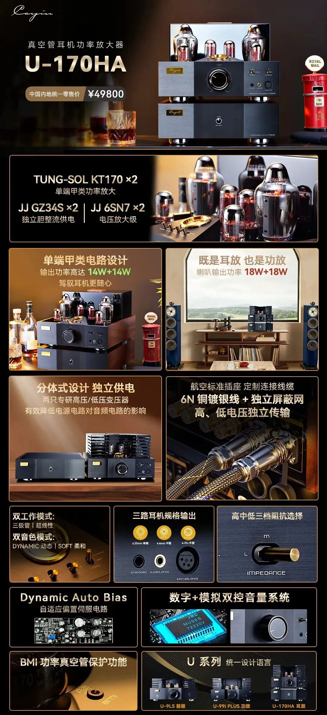 U-170HA 台式胆耳放,KT170 单端甲类分立电源纯胆耳放!采用两支束射管家族代表作 TUNG-SOL KT170 做单端甲类功率放大,电源、主机分体式设计,更有双模式(三极管/超线性)、双音色(动态/柔和)设计,多种声音风格,聆听更多可能!