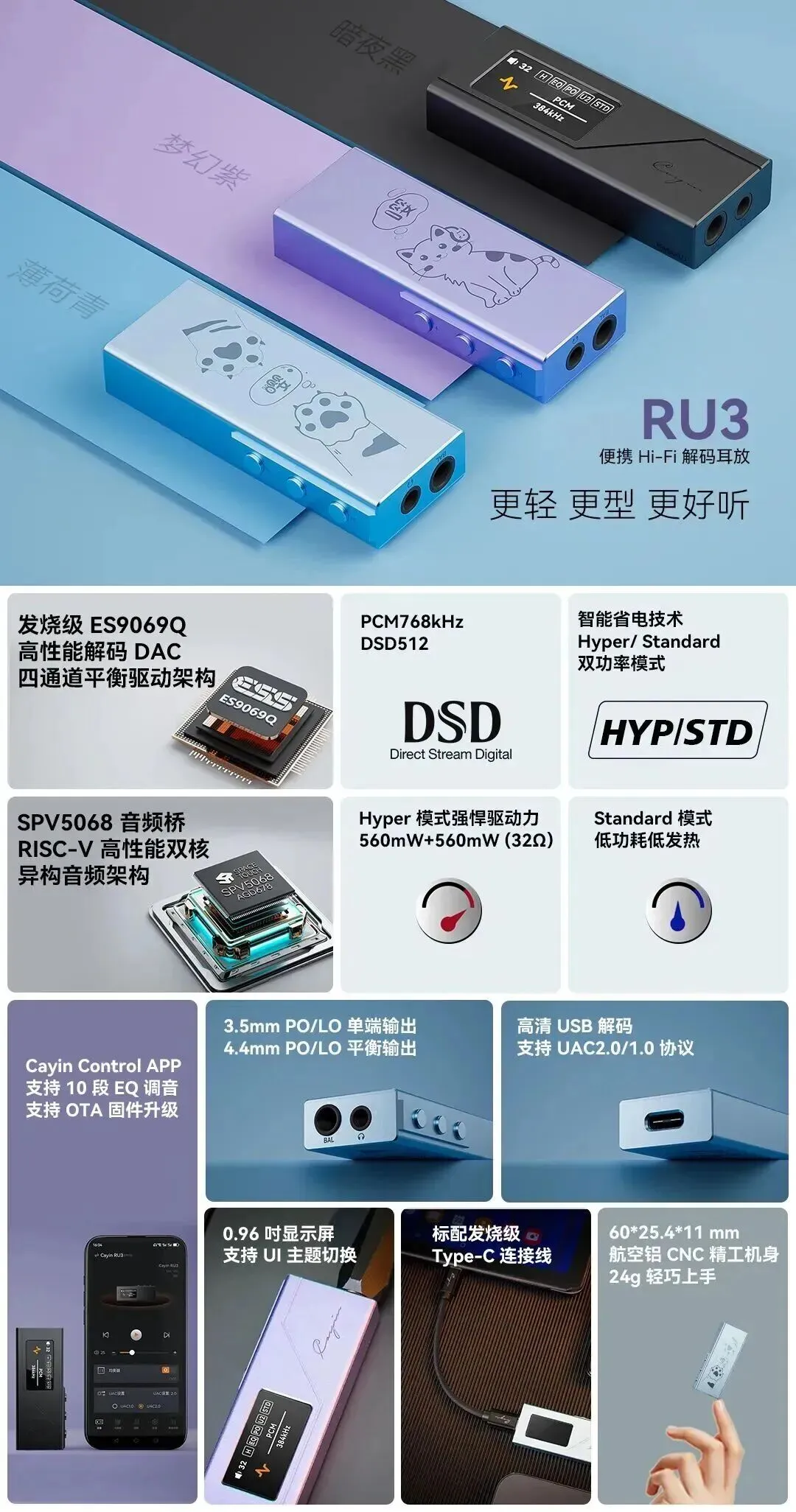 便携解码耳放 RU3,提供三种颜色选择,为不同喜好的用户带来更多元的搭配可能。