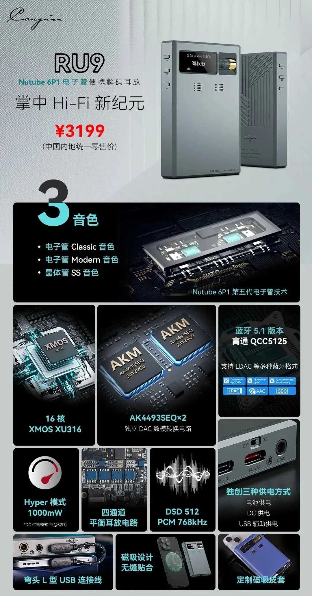 Nutube 6P1 大尾巴——RU9电子管随身解码耳放,单端 3.5mm 和平衡 4.4mm PO / LO 都可以一键切换三种完全不同风格的音色。